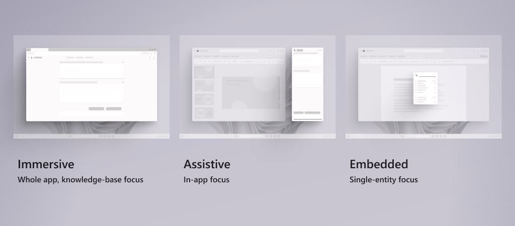 Before diving into specific components, it helps to understand the three structural frames that products use to house AI capabilities. Microsoft's Copilot UX guidance codifies these as Immersive, Assistive, and Embedded. learn.microsoft
